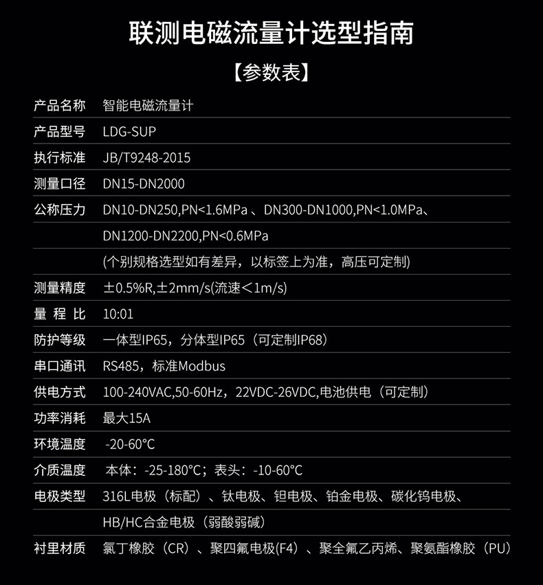 聯(lián)測LDG-SIN電磁流量計適用于化工助劑、海綿城市、給水排水、水利灌溉、水處理、污水處理(環(huán)保污水控制、化工污水、電鍍污水)、造紙漿液(紙漿)、泥漿、醫(yī)藥原料、食品等工農(nóng)業(yè)的生產(chǎn)公司過程流量測量和控制,標(biāo)配485通訊功能。