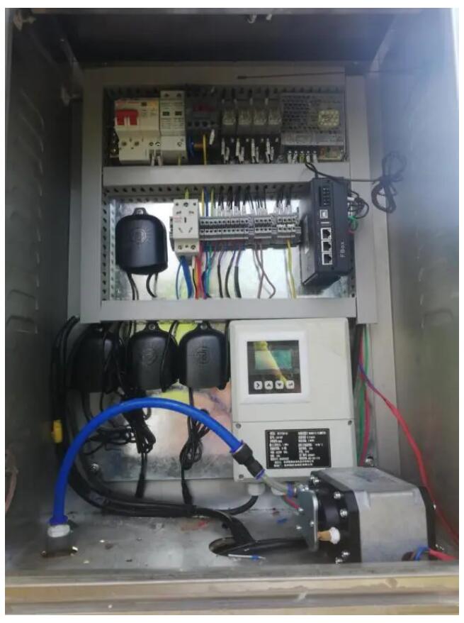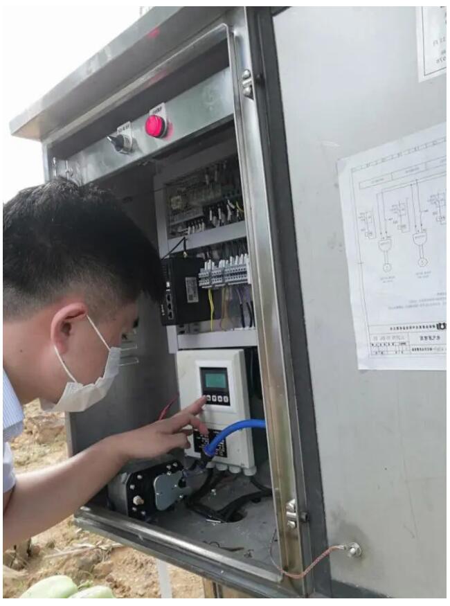 鄒工在現場調試,電磁流量計進行計量,數據通過云平臺進行監控,現場總計裝有56臺分體式電磁流量計。