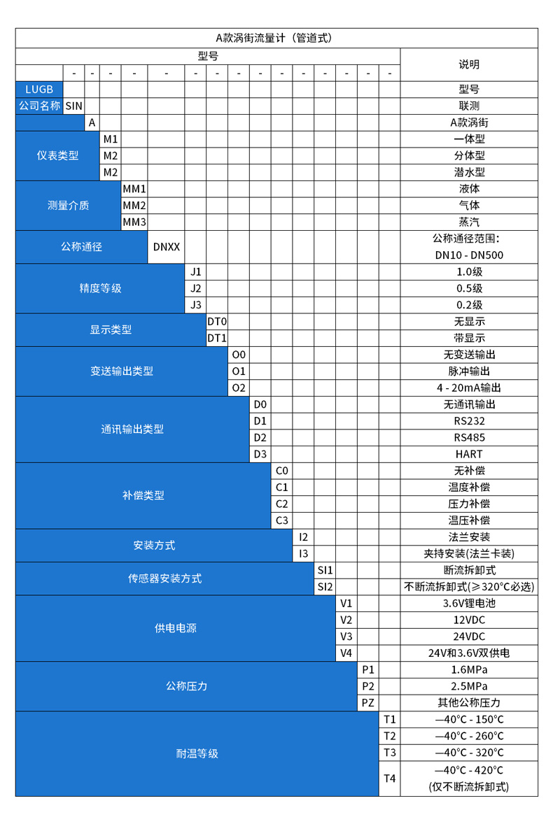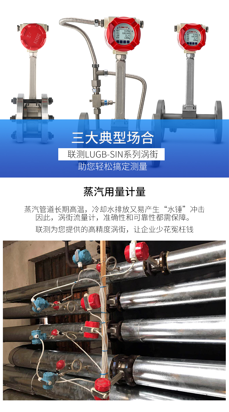 LUGB-SIN-A渦街流量儀表廣泛用于供熱公司、熱力公司、化工行業等行業,對過熱蒸汽、飽和蒸汽、壓縮空氣和一般氣體、水和液體的計量和控制。加厚本體,可有效避免現場管道振動帶來的數據波動和誤差。多用于高溫場合,例如過熱蒸汽等工況。