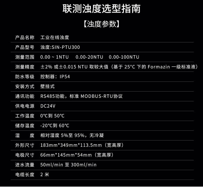聯(lián)測_SIN-PTU300三個量程段規(guī)格,分別為0-1NTU量程段,0-20NTU量程段,0-100NTU量程段,其中0-1NTU量程段主要應用出水濁度低、測量要求高的場合,其最低檢出限為0.015NTU,可穩(wěn)定監(jiān)測<0.1NTU水質(zhì),可配套小型凈水設備。